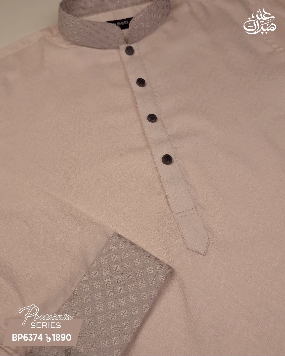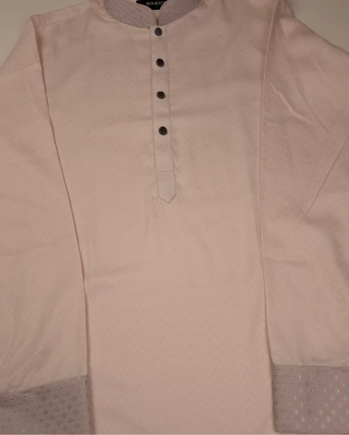 Designed for men who appreciate subtle statement styling, this Panjabi features contrast fabric detailing on the collar and sleeve cuffs. The carefully selected contrasting tones add visual depth while maintaining a clean and refined ethnic look.